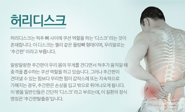 여러 개의 작은 척추뼈가 모여서 척추라는 인체의 기둥을 이루게 됩니다. 척추뼈 사이에는 척추뼈끼리 부딪치는 것을 막아주는 쿠션과 같은 역할을 하는‘디스크(disc)’라는 말랑말랑한 젤리 같은 구조물이 있습니다. 우리말로는‘추간판’이라고 부릅니다.