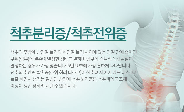 척추 분리증은 척추신경이 지나가는 척추뼈 뒤쪽에 연결부위에 금이 가거나 끊어진 상태를 말합니다. 어느 한순간의 충격으로 발생하지 않고 충격이 축적되면서 오랜 시간에 걸쳐 발생합니다. 원래 하나의 뼈로 연결돼 있어야 할 척추뼈가 결손 부위에서 앞쪽과 뒤쪽으로 분리돼 있으므로, 척추뼈가 하나로 움직이지 못하고 앞뒤가 따로 움직이는 상태입니다. 이로 인해 척추뼈의 안정성에 문제가 생기게 되고 조금 더 진행되면 금이 간 부위의 위, 아래 부분이 서로 어긋나 척추 전방 전위증이 될 수 있습니다.
