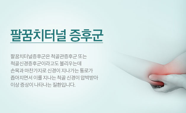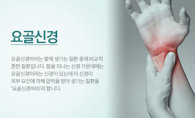 척골신경은 손바닥 안쪽 근육을 지배하고 손바닥 안쪽 피부 지각을 주관하는 신경으로 손의 섬세한 움직임에 도움을 주는 수부 근육 중 하나로 중요한 운동 신경이라고 할 수 있습니다. 그렇기 때문에 팔꿈치 뿐만 아니라 새끼손가락을 비롯하여 네번째 손가락(약지)과 손바닥 전체에 증상이 나타날 수 있는데요, 주증상은 저릿저릿한 느낌과 통증입니다.