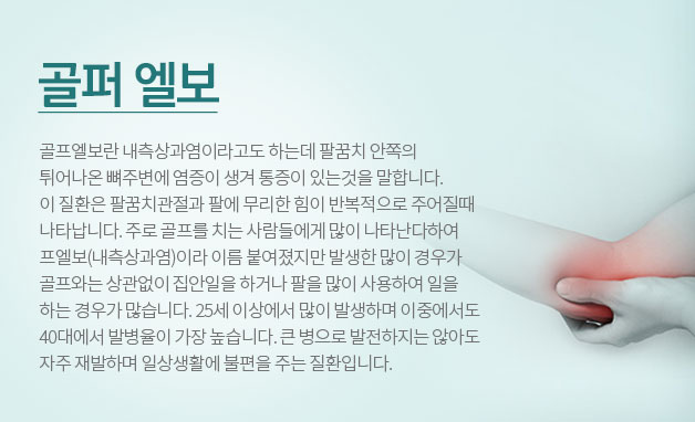 내측상과염(골프엘보)의 증상은 팔꿈치 안쪽의 통증입니다. 이곳을 누르면 아픕니다. 또 물건을 잡거나 걸레를 짤때, 손목이나 팔을 비트는 동작시 통증이 심합니다. 아침에 자고 일어났을때 팔꿈치가 뻣뻣하기도 합니다.