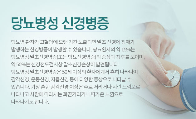 당뇨신경병증은 크기 감각신경병증, 운동신경병증, 자율신경병증으로 나눌 수 있습니다. 감각신경병증의 증상으로는 양쪽 발 양말을 신은 듯한 부위 혹은 양쪽 손 장갑을 낀 듯한 부위에 저리거나, 따끔거리거나, 찌르는 듯한 감각, 화끈거림이 나타날 수 있습니다. 이러한 이상 감각은 양측이 대칭적으로 발생하고 발끝 혹은 손끝에서 시작하여 점차 위로 올라오게 됩니다. 통증은 밤에 더 악화되는 특징이 있습니다. 혈당 조절을 원활히 하면서 시간이 지나면 대부분 좋아집니다. 다만 감각이 소실되는 경우도 있습니다. 운동신경병증이 발생하면 국소적인 다리근력이 약화되거나 눈을 움직이는 근육이 마비되어 물체가 이중으로 보이는 현상이 나타날 수 있습니다. 자율신경병증이 발생하면 위마비 증상으로 소화가 안 되고 기립성저혈압, 발기부전 등의 증상이 발생할 수 있습니다.